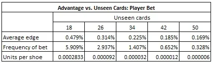 Maybe he’s the world’s most perfect card counter. Or perhaps he is using a computer. Or maybe he is just psychic. It doesn’t matter. Just assume this player somehow knows exactly when he has the edge over the house and whenever he does, he bets $1000. The practical limitations on the earning potential for this player are profound -- $1.58 per shoe for a wager size of $1000.