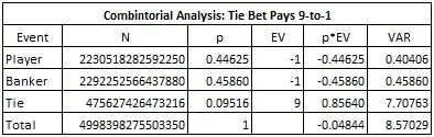 I begin with the case when the Tie bet pays 8-to-1. This is the most common version world-wide. The following table gives the combinatorial analysis for the Tie bet in this case, showing a house edge of 14.36%: