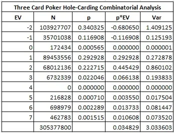 If an inspired reader, on either side of the table, wants to learn how to analyze and program hole-carding opportunities, I recommend 3CP as a good starting problem. It is just tough enough to require some careful thought, but it is easy enough that you can figure it out yourself. Moreover, you can write your program in VBA and still have the cycle runin a relatively brief period of time (cycle length = 1,221,511,200, which can be reduced to 305,377,800 if you only consider clubs for the hole-card). 3CP was my first game (way back in 2002). Use the numbers presented here to give it a try.