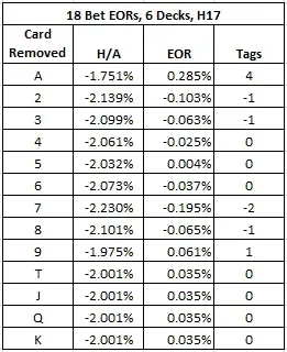 The following table gives the EOR’s and a card counting system for the six-deck version: