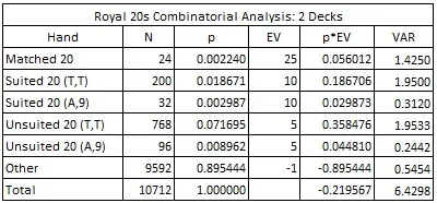 Back in 2003, when I was still a player, I advocated playing against the Lucky Ladies (LL) bet. Back then, there were a few great opportunities, particularly in Washington State. In early October, 2003, I stumbled on a variation of the LL concept on the tables at the Plaza casino in downtown Las Vegas. The new side bet I observed was called “Royal 20s” (R20). The idea was similar to LL: the player was paid on any two-card 20. The main difference from LL was that there was no special payout for a pair of Queen of Hearts (with or without a dealer blackjack). The value lost from removing the top payouts from LL was given back to the player by raising the payout for an unsuited 20.