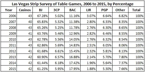 - The table game that showed the greatest increase was baccarat. It increased from 272 tables in 2006 (7.77% of all tables) to 447tables in 2015 (13.17% of all tables).